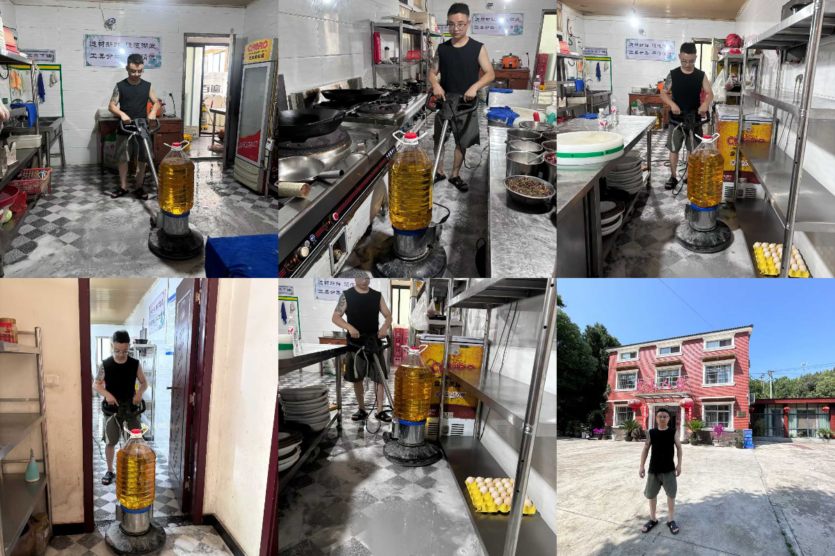 2025年5月22日,湖北世卿代理商独自前往湖北省宜昌市点军区的《巴山人家》,为其进行厨房地面防滑。出发前,我仔细检查并携带了洗地机、防滑剂、施工桶等专业工具,深知此次任务的挑战——厨房仿古砖上厚重的油污,将是清洁与防滑处理的最大阻碍。抵达《巴山人家》厨房后,仿古砖的纹理缝隙中藏污纳垢。我没有丝毫犹豫,迅速开启洗地机。这款洗地机功能强大,针对重油污清洁进行了优化。我将其功率调至最大,启动清洁模式,让强劲的吸力作用于地面。洗地机的滚刷高速旋转,与仿古砖表面紧密贴合,深入纹理,一点点将油污剥离。对于洗地机难以触及的墙角和设备边缘,我手持抹布,蘸取专门的油污清洁剂,用力擦拭。遇到特别顽固的油污,我便用小刷子配合,一点点将其刷掉。在这个过程中,洗地机的污水箱很快就满了,我多次停下手中的工作,前往水槽倒掉污水,重新换上干净的清水,以保证洗地机始终能以最佳状态工作。经过长达两个多小时的深度清洁,原本油污厚重的厨房地面终于焕然一新,仿古砖的本色显露出来,纹理也清晰可见。地面清洁干净后,我开始进行厨房地面防滑。将防滑剂倒入施工桶,随后,我用兔毛刷均匀地将防滑剂涂抹在地面上,确保每一块仿古砖都被覆盖到。涂抹完成后,我按照规定的时间等待防滑剂渗透,之后用清水将地面彻底冲洗干净。厨房地面防滑后,地面虽然看起来和之前无异,但已经具备了出色的防滑性能,能为《巴山人家》厨房的工作人员提供安全保障。