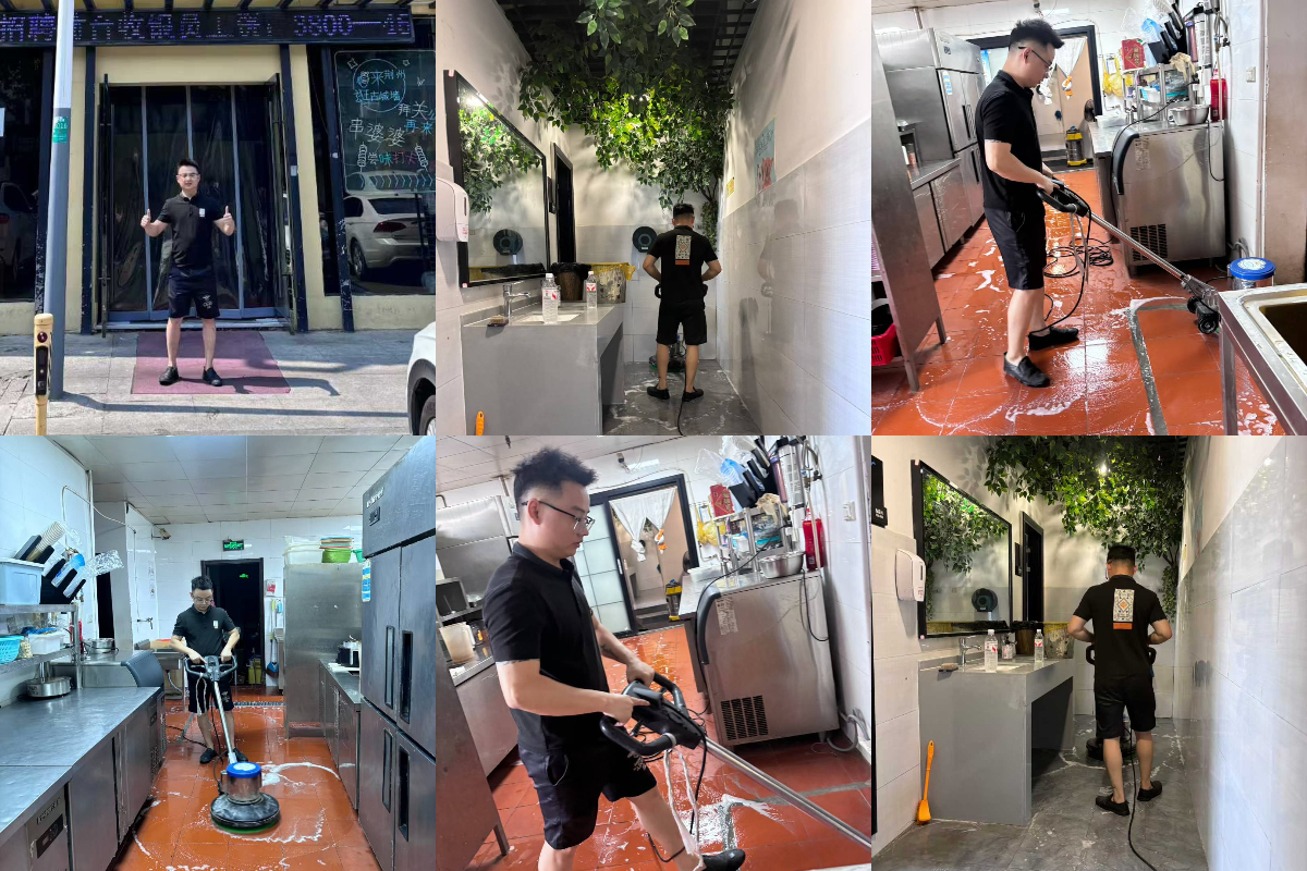 2025年7月8日,世卿贵州团队来到《串婆婆火锅串串香总店》,为店内进行火锅店防滑施工。首先开展清洁工作,针对食堂地面的厚重油污,将去油去污清洁剂按比例稀释后倒入施工桶,启动洗地机配合清洁剂对大面积地面进行擦洗,洗地机的强劲动力能有效瓦解油污。对于灶台周围、餐桌下方等洗地机难以清洁的角落,用兔毛刷蘸取清洁剂反复刷洗,确保油污彻底清除。厕所地面则重点清理水渍和污垢,同样先用洗地机整体清洁,再用兔毛刷处理边角缝隙。清洁完成后,用洗地机吸干地面水分,等待干燥。我们先对食堂地面分区域涂刷防滑剂,尤其关注打餐台附近、过道等人员密集区域;随后对厕所地面进行同样处理,重点涂抹便池周边、洗手台下方等易积水处。火锅店防滑施工涂刷过程中,确保每块瓷砖都被防滑剂均匀覆盖。防滑剂作用到位后,用清水冲洗地面,再用洗地机吸干污水,边角积水用吸水器处理。经过一天火锅店防滑施工,食堂和厕所的瓷砖防滑处理完成。