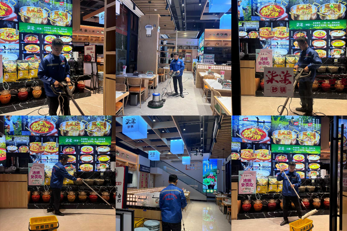 2025年4月22日,我们为湖北省宜昌市《柒柒砂锅》进行了瓷砖防滑处理。餐馆作为人流量较大且地面易沾染油污、水渍的场所,地面防滑尤为重要,此次瓷砖防滑处理旨在降低顾客用餐时滑倒的风险。施工前,我们准备了兔毛刷、施工桶、洗地机等工具,以及专剂8.0世卿防滑剂。首先,使用洗地机对瓷砖地面进行全面清洁。洗地机能够高效清除地面的油污、食物残渣等污渍,相较于人工清洁更彻底,为后续防滑剂的涂抹创造了干净的基础。清洁过程中产生的污水及时清理,确保地面无明显积水和杂物。清洁工作完成后,便开始进行防滑剂的涂抹。我们将专剂8.0世卿防滑剂倒入施工桶中,方便取用。随后,用兔毛刷蘸取防滑剂,均匀地涂抹在瓷砖地面上。兔毛刷的刷毛柔软且分布均匀,能保证防滑剂充分覆盖瓷砖表面,尤其是瓷砖的缝隙处也能得到妥善处理,让防滑剂更好地渗透,发挥最佳防滑效果。在涂抹过程中,我们注意控制防滑剂的用量和涂抹速度,确保每一块瓷砖都能均匀附着防滑剂。待防滑剂作用一段时间后,按照产品要求进行后续瓷砖防滑处理,最终完成了《柒柒砂锅》的瓷砖防滑处理工作,为餐馆营造了更安全的用餐环境。