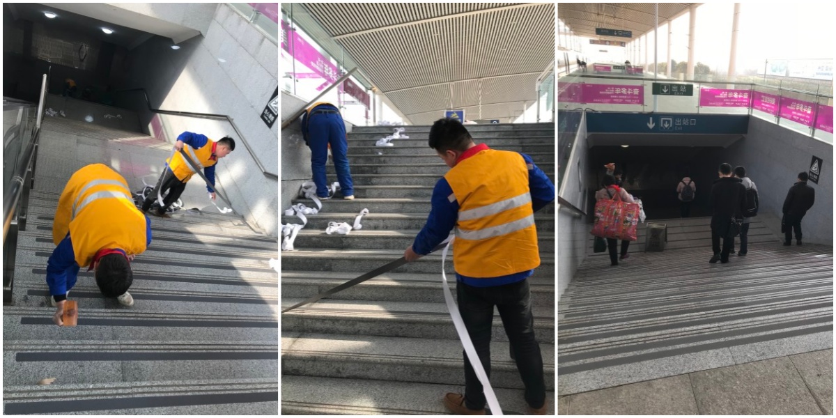 2019年1月22日,世卿防滑顺利完成上海铁路局旗下高铁站之一滁州高铁站楼梯防滑处理任务!滁州高铁站作为长三角重要交通枢纽,日常客流量大,临近春运期间人员流动更为密集,站内楼梯作为核心通行通道,原有地面遇潮湿、雨雪天气极易湿滑,存在旅客滑倒摔伤的安全隐患。上海铁路局为落实公共区域安全防护标准,委托世卿防滑开展全站楼梯专项防滑改造,要求施工高效、不影响车站正常运营,且防滑效果持久稳定。结合高铁站运营特点和楼梯使用场景,世卿防滑选定专业防滑胶带铺贴方案,这个方案施工便捷、无异味无污染,适配高频次通行需求,且不破坏楼梯原有美观,完美契合车站不停运施工要求。施工团队提前清理楼梯地面灰尘、污渍,保障基层干燥平整,再根据台阶尺寸精准裁切胶带,规范铺贴、细致加固,全程避开客流高峰,采用无尘静音施工,专人现场疏导,最大限度减少对车站运营的干扰,当日便高效完成全部施工任务。滁州高铁站楼梯防滑处理项目完工后,经上海铁路局现场验收,各项指标全部达标,防滑效果优异。铺贴防滑胶带后,楼梯表面摩擦力大幅提升,彻底解决潮湿环境下的湿滑问题,有效杜绝滑倒风险,适配高铁站大客流、高频率使用的场景。此次项目是世卿防滑服务交通枢纽领域的典型实践,凭借专业方案、高效施工和过硬品质,圆满完成铁路系统防滑任务,为公共交通场所安全防护升级提供了可靠范本,也进一步彰显了世卿防滑在专业防滑领域的技术实力与服务水准!